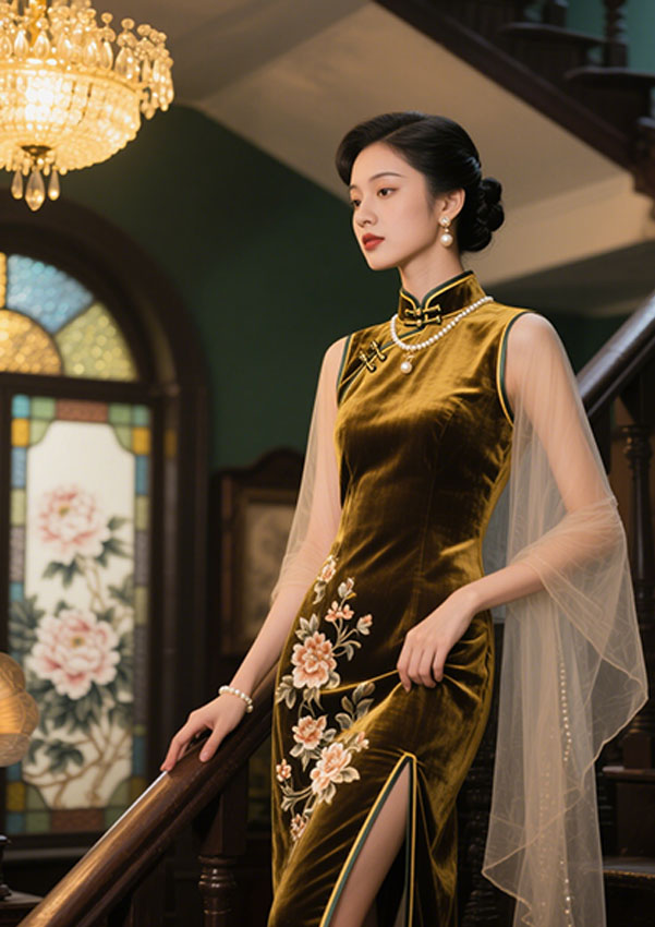 庆典旗袍承袭民国海派旗袍的形制精髓,融合京派刺绣的华贵与苏工剪裁的雅致,专为婚礼、晚宴、国事等重大场景而生。其设计以“形制为骨、纹样为魂”,保留立领斜襟、开衩盘扣等经典元素,通过立体剪裁重构曲线美学,确保行走时裙摆如流水般舒展,静立时腰臀曲线若隐若现,诠释“藏与露”的东方审美哲学。